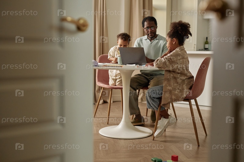 Черная девушка размышляет над заданием, в то время как отец помогает с домашней работой за столом в гостиной