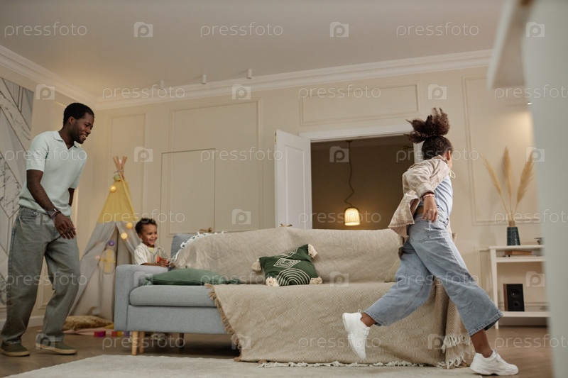 Улыбающийся афроамериканский папа играет с детьми в тег-игру Бегает по дивану внутри