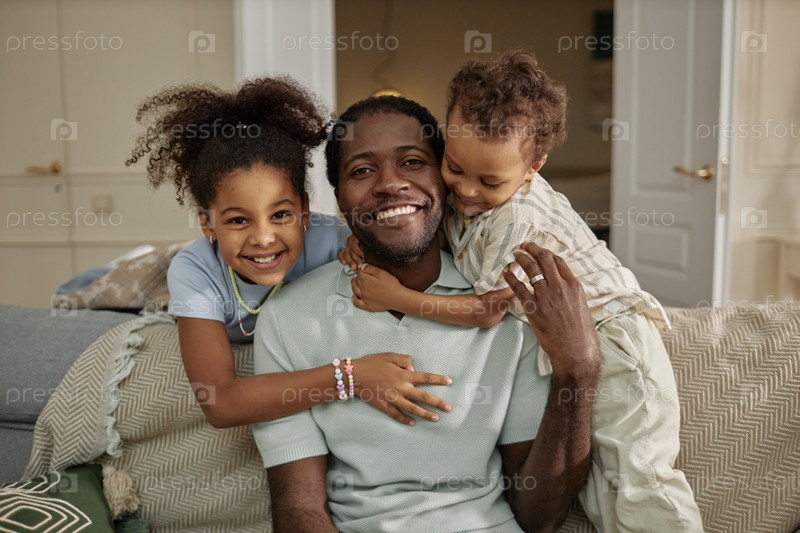Портрет счастливого отца и маленьких детей, обнимающихся во время позирования на диване в помещении
