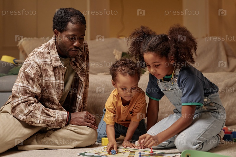 Маленький черный мальчик и девочка играют в настольную игру с папой, сидящим на полу дома