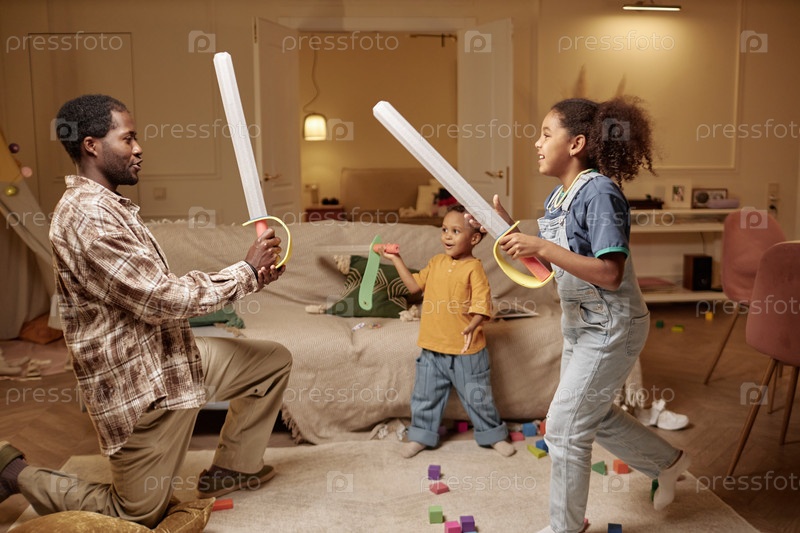 Черный мужчина борется с игрушечными мечами, играя в то же время с детьми дома