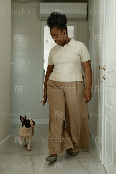 Улыбающаяся чернокожая женщина в домашней одежде ходит с милым французским бульдогом, следующим за ней дома