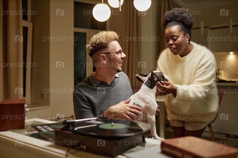 Черная женщина ласкает собаку, сидя на коленях у мужчины, наслаждаясь временем дома Happy