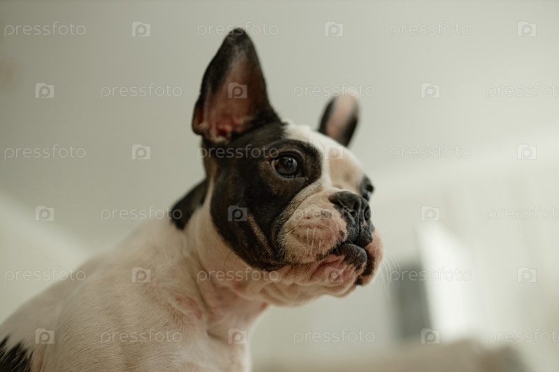 Портрет милого французского бульдога, сидящего в помещении на размытом фоне