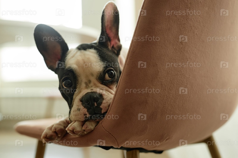 Портрет французского булдога, лежащего на стуле дома