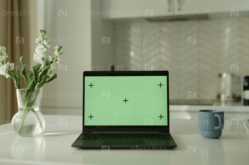 Ноутбук с зеленым моковым экраном на стойке в кухне Open Laptop with Green Mockup Screen on Counter in Kitchen