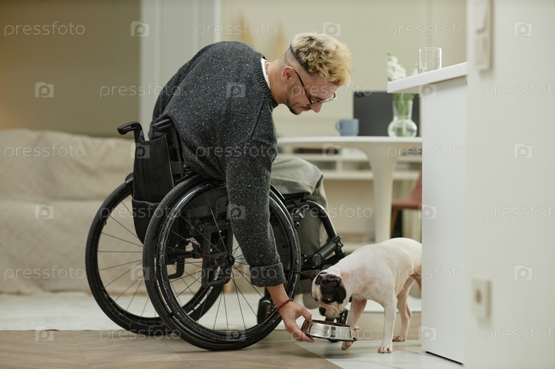 Взрослый мужчина с помощью инвалидной коляски кормит бульдога на кухне дома