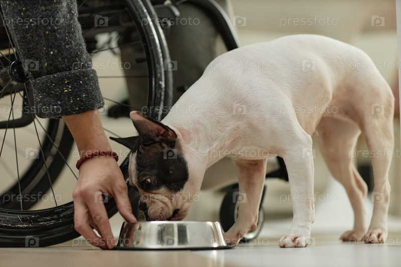 Голодный французский бульдог ест собачью пищу из миски, в то время как человек на инвалидном кресле кормит домашнего животного на кухне