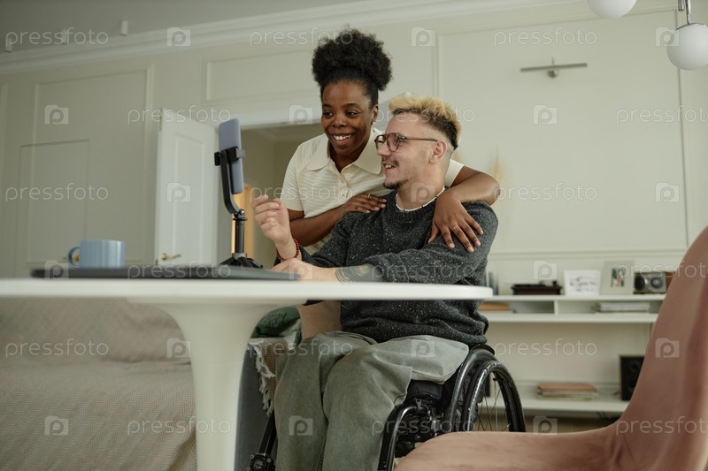 Улыбающаяся чернокожая женщина обнимает мужчину с помощью инвалидной коляски, записывая видео на телефон в помещении