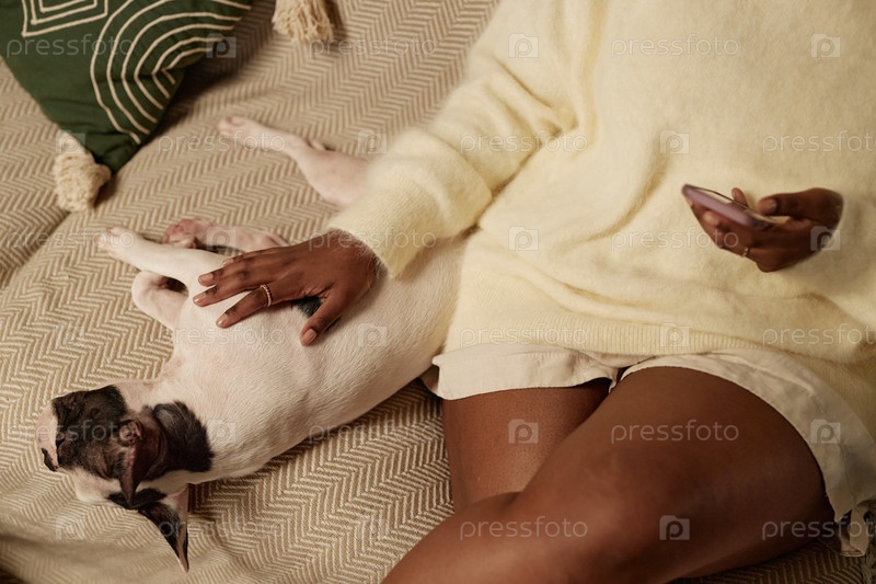 Черная женщина ласкает расслабленную собаку, лежащую на диване рядом с хозяином дома