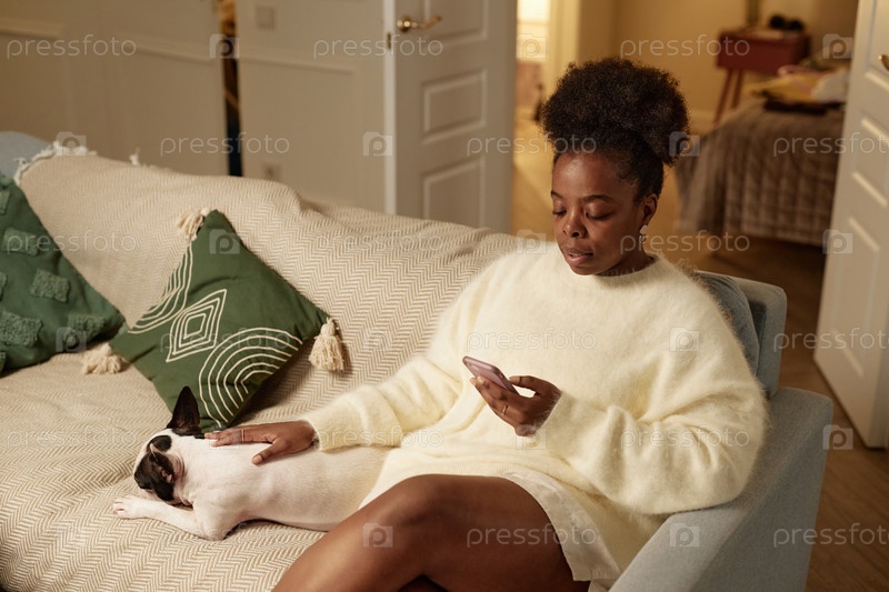 Расслабленная чернокожая женщина сидит на диване с собакой, использующей телефон дома