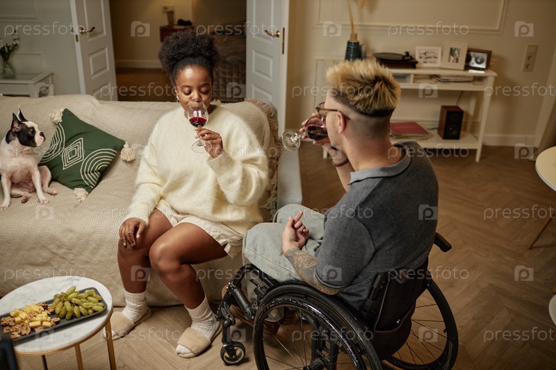 Черная женщина наслаждается напитком Пьет вино на свидании с мужчиной, использующим инвалидное кресло дома