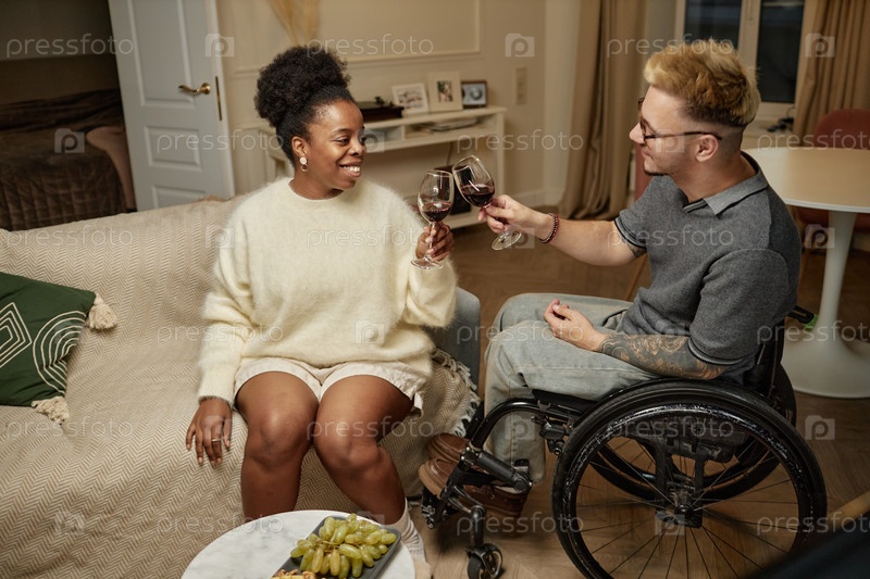 Улыбающаяся чёрная женщина поднимает тост на свидании с бойфрендом, используя инвалидное кресло дома