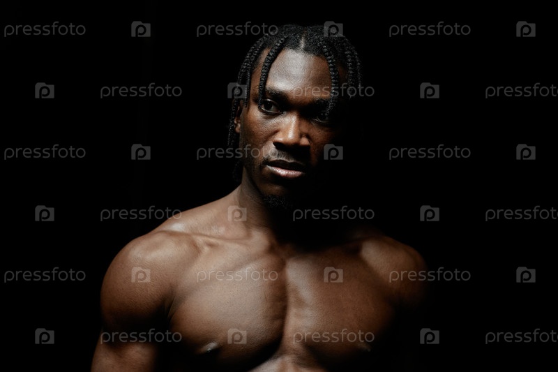 Портрет самоуверенного без рубашки чернокожего мужчины, оглядывающегося в сторону при контрастном свете