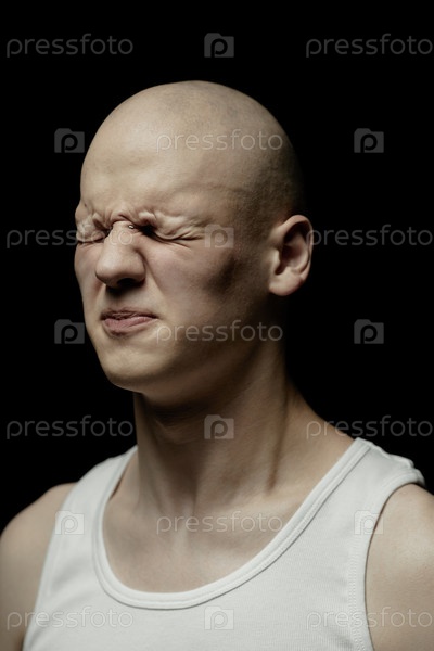 Портрет лысого мужчины, трахающего глаза и страдающего от панической атаки в темной студии