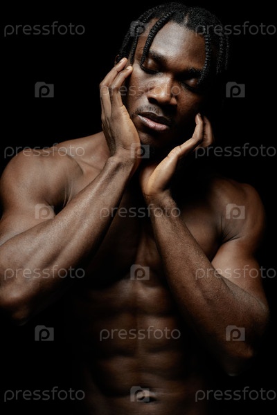 Портрет без рубашки чернокожего мужчины с закрытыми глазами, прикасающегося к лицу и стоящего в контрастном свете