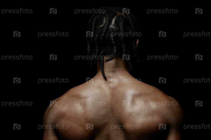 Обратная сторона чернокожего мужчины, позирующего без рубашки на чёрном фоне