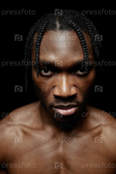 Портрет серьезного чернокожего мужчины с пряжами, смотрящего на камеру в жестком свете в студии