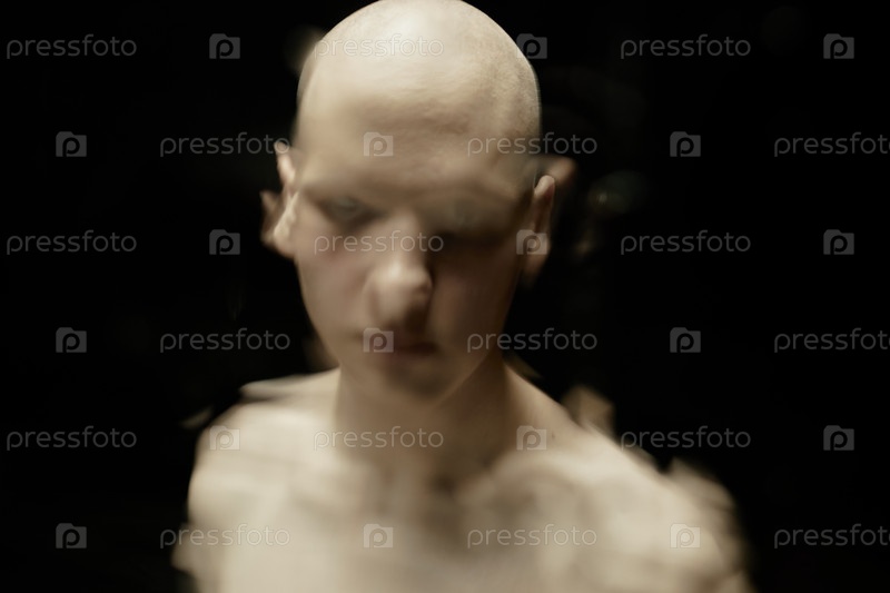 Извращенное водой изображение лысого мужчины, смотрящего с пугающим взглядом на камеру в темной студии