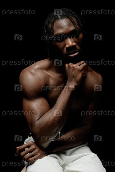 Портрет без рубашки чернокожего мужчины, позирующего с рукой возле подбородка в контрастном свете в студии