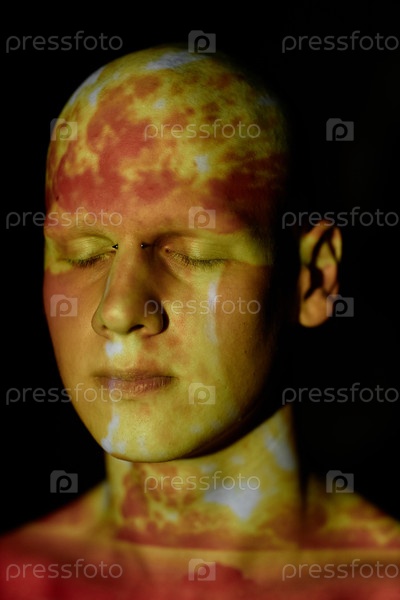 Портрет лысого мужчины с закрытыми глазами, позирующего с изображением атомного взрыва, проецированным на лице