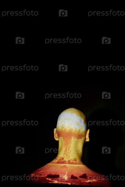 Задний вид человека с лысой головой и взрывом бомбы, проецированного на череп в темной студии