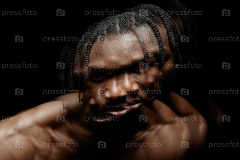 Извращенный портрет чернокожего мужчины, пялящегося в камеру, позирующего при контрастном свете в студии