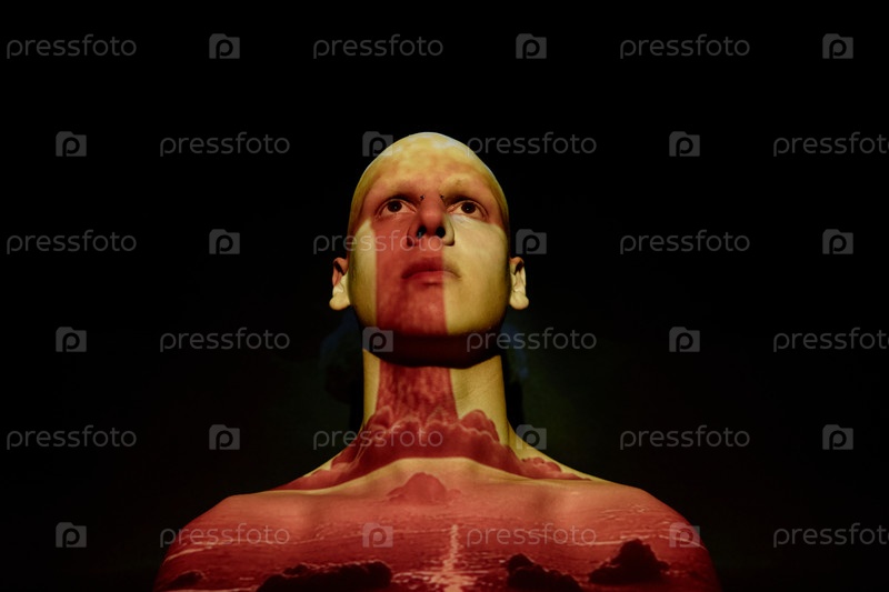 Человек с отделенным взглядом в проекторе Свет смотрит на ядерный взрыв против чёрного