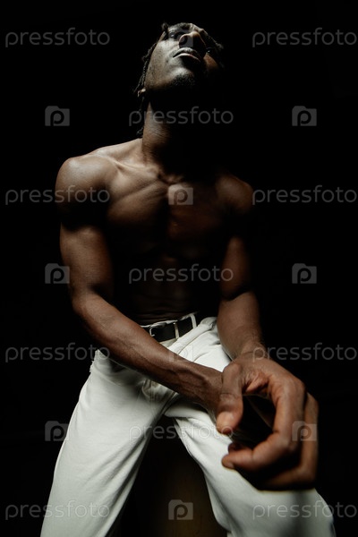 Портрет без рубашки чернокожего мужчины, который отворачивается и позирует в контрастном свете