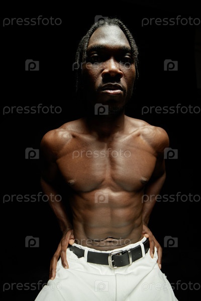 Портрет без рубашки черного мужчины, уверенно позирующего в контрастном свете в темной студии