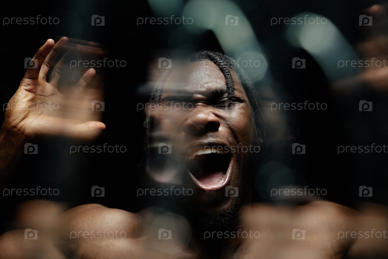 Портрет отчаянно кричащего черного человека с закрытыми глазами в темной студии
