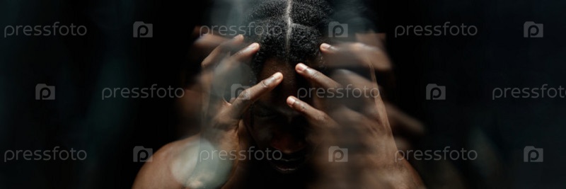 Header Image of Черный мужчина, покрывающий лицо руками, страдает от головной боли в студии