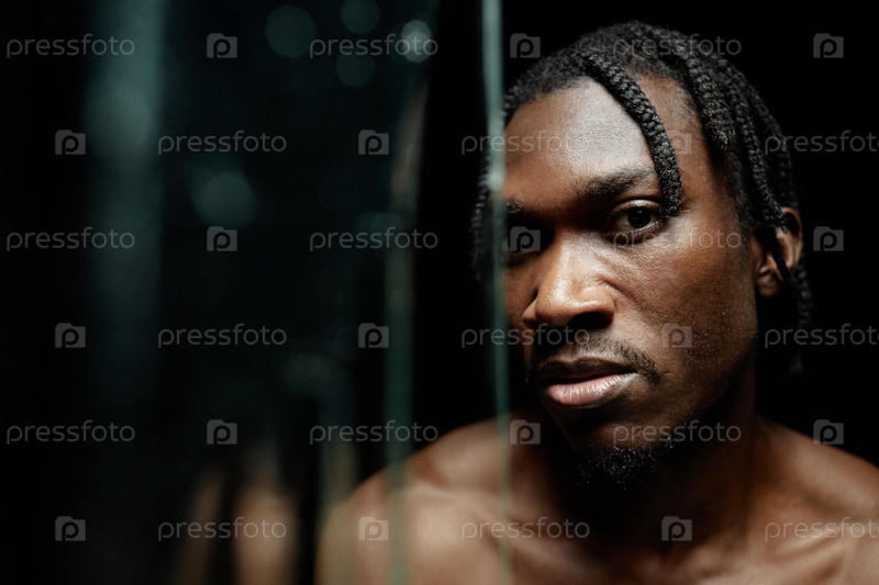 Портрет спокойного чернокожего мужчины, смотрящего на камеру в контрастном свете