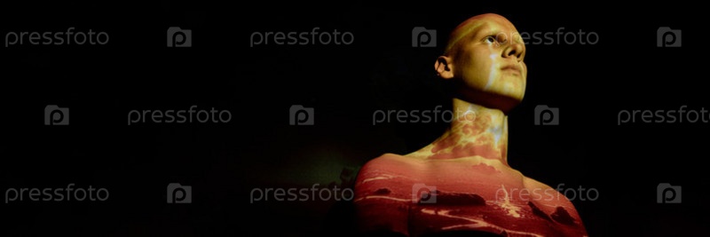 Header Image of Shirtless Bald Man Стоящий в проекторе света, наблюдающий за атомным взрывом в студии