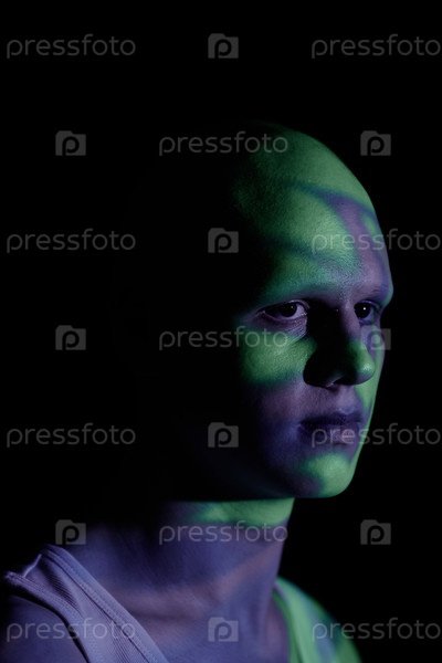 Портрет человека, оглядывающегося в сторону Стоящий в синем проекторе Свет в темной студии
