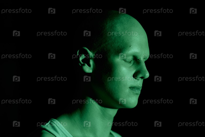 Профиль лысого мужчины с закрытыми глазами, стоящего в зеленом проекторе Свет в темной студии
