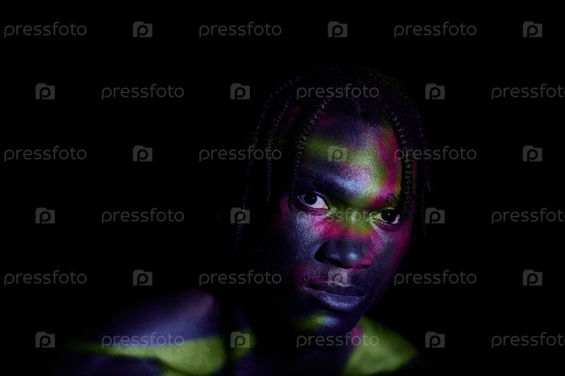Портрет чернокожего человека со страшным внешним видом, стоящего под яркими огнями проектора