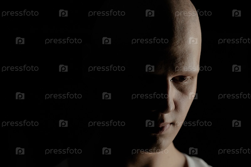 Печальный лысый мужчина смотрит вниз на черный фон в студии