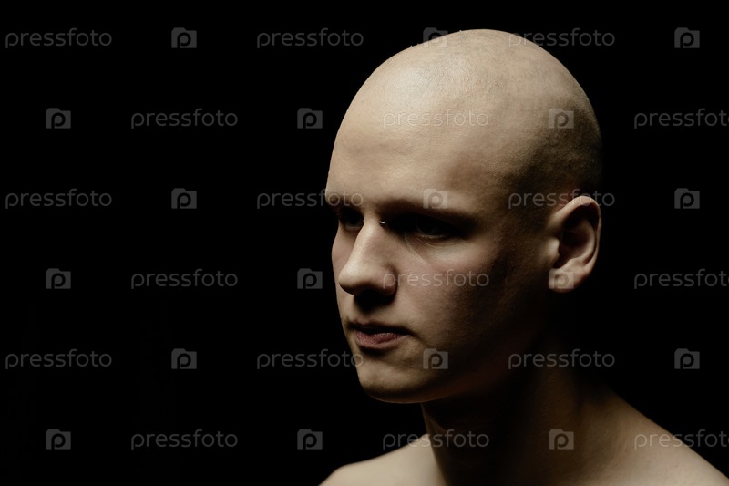 Лысый мужчина, стоящий в верхней части SIide Light Casting Pale Shadows on Face in Black Studio