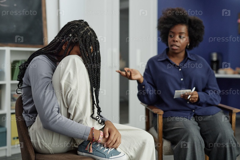 Черная девочка-подросток плачет во время сеанса терапии с психологом, который разговаривает