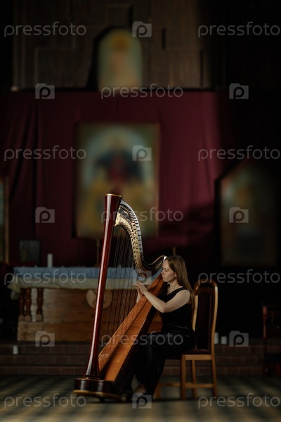 Женщина-гарпистка играет на струнном инструменте Исполняет музыку в церкви при тусклом свете
