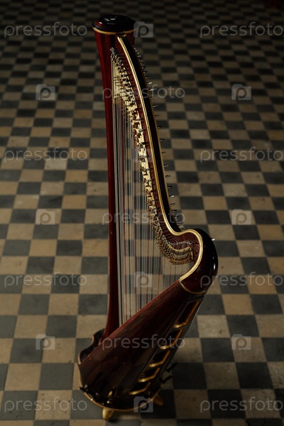 Антикварная арфа, стоящая в тусклом свете захваченной церкви
