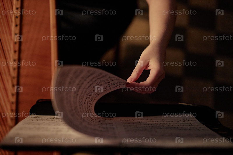 Женская рука переворачивает страницу с музыкальными нотами, играя на арфе при низком ключевом освещении в помещениях