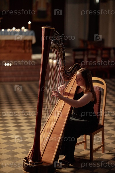 Музыкантка играет музыку на арфе в темно освещенной церкви