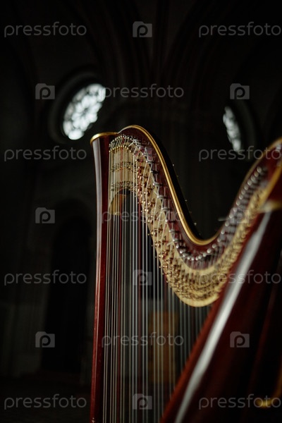 Струны античной арфы с деревянной изогнутой рамой, стоящей в церкви со слабым светом
