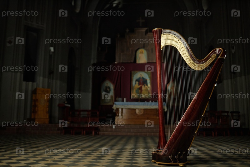 Элегантная арфа, захваченная в церкви с профессиональным низким ключевым светом
