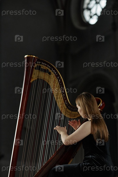 Женщина, нежно играющая на арфе, исполняющая классическую музыку в церкви