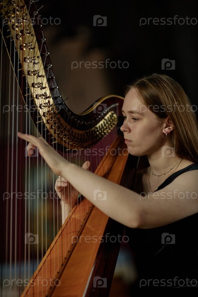 Портрет женщины-гарпистки, выбивающей струны инструмента, играющего классическую музыку на сцене