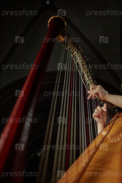 Женщина играет на арфе, выбивая струны инструмента во время исполнения в церкви