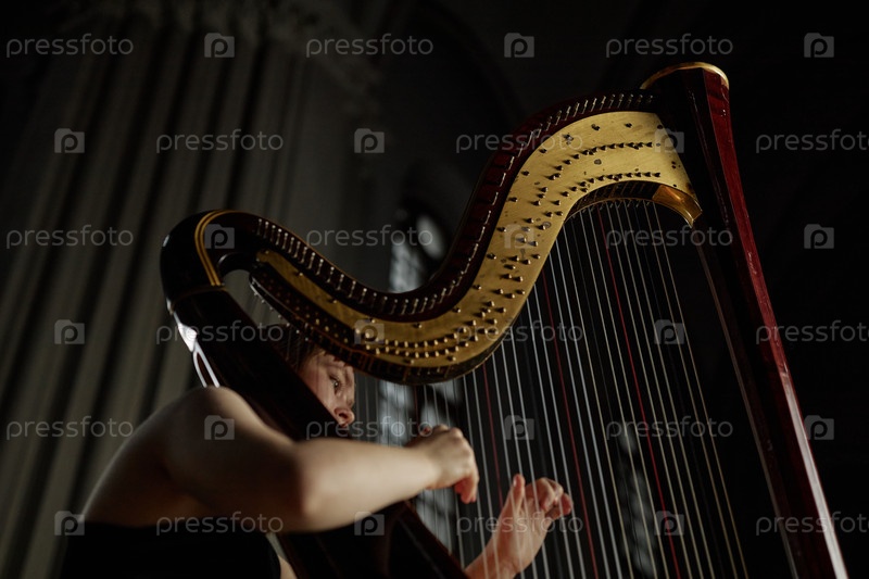 Музыкантка играет музыку на древней деревянной арфе в темном освещении